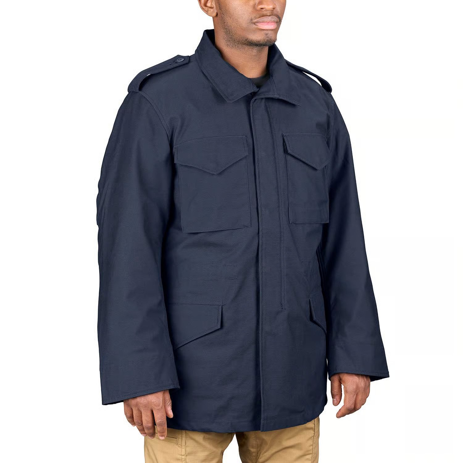 This uses a weather-resistant outer shell designed to withstand cold wind, light rain, and daily abrasion. Military-style jackets prioritize durability over delicate fashion fabrics, a principle supported by textile standards discussed by ASTM International and ISO Apparel Guidelines.