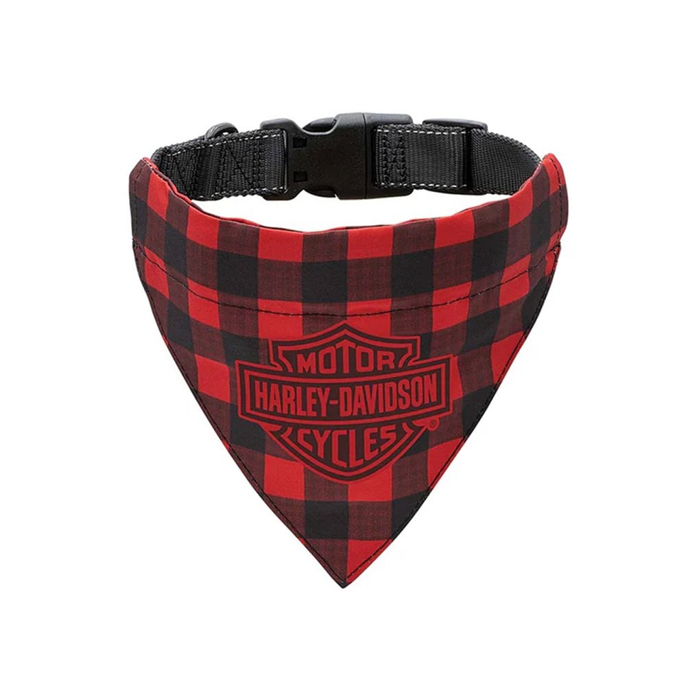 • Ride in style with our Harley-Davidson Holiday Water-Resistant Embossed B&S Adjustable Collar Clasp Plaid! Made with a durable, water-resistant fabric, this red and black buffalo plaid bandana features the iconic Bar & Shield logo. Plus, it comes with an adjustable nylon collar, complete with an embossed Open Bar & Shield on the clasp. Perfect for large and extra-large pets.