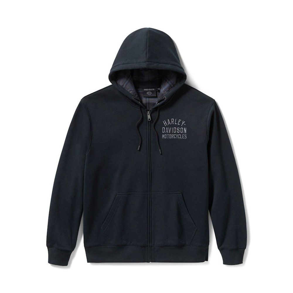 Hoodie crafted for riders who value warmth, durability, and iconic Harley-Davidson design. Features a plaid-lined interior, full zip front, and premium fleece for comfort on and off the bike.