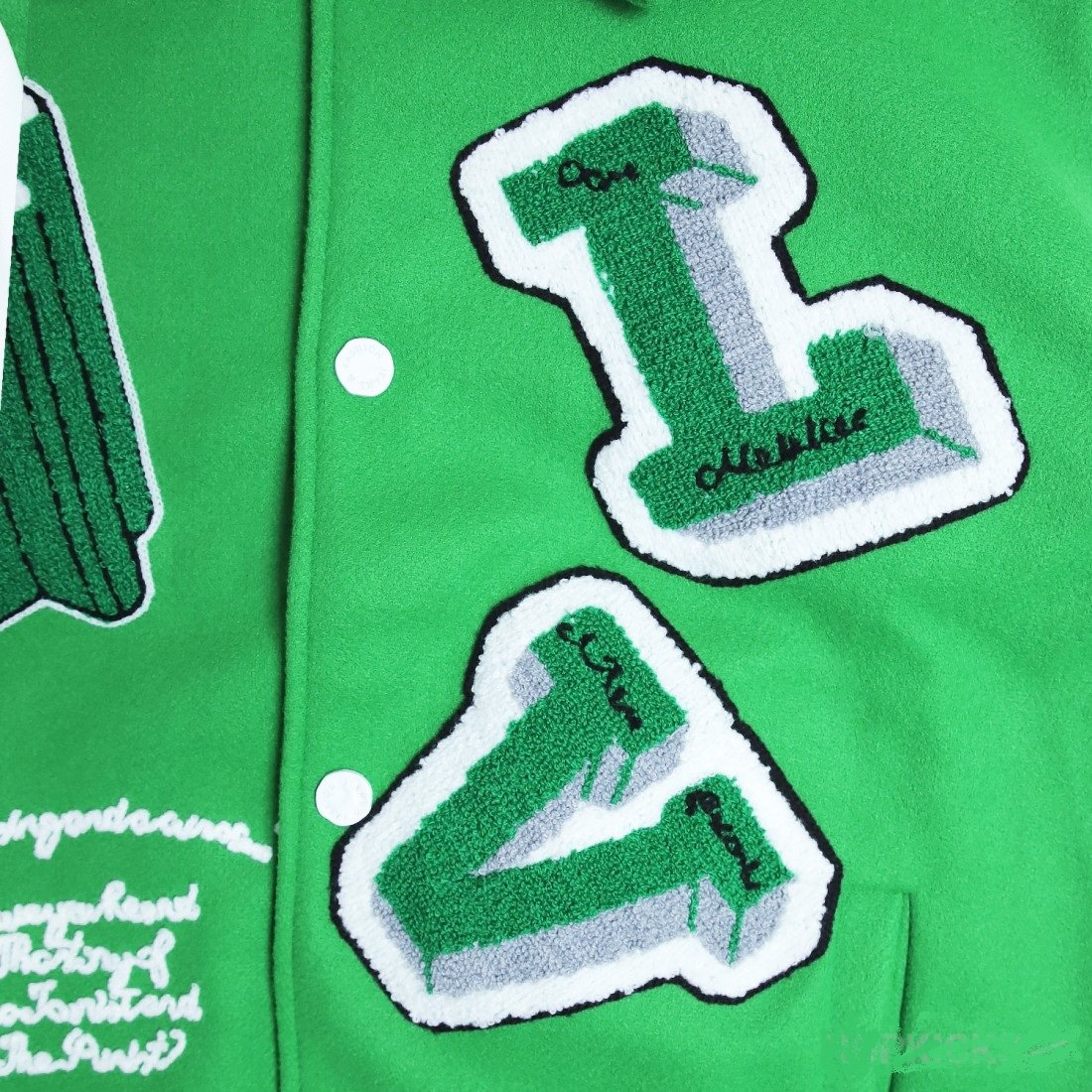 - Patches: Hand-stitched chenille LV logos, “1948inspired lettering