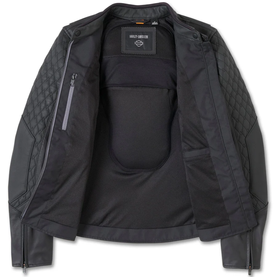 This leather jacket uses midweight cowhide leather for lasting durability. Its polyester mesh lining ensures breathability. Furthermore, padded quilting on sleeves and sides adds style. The Airprene collar with a snap-tab provides comfort. For care tips, check RevZilla’s leather guide. Consequently, this jacket endures tough rides while keeping you comfortable. Additionally, find gear at Daytona Harley-Davidson.