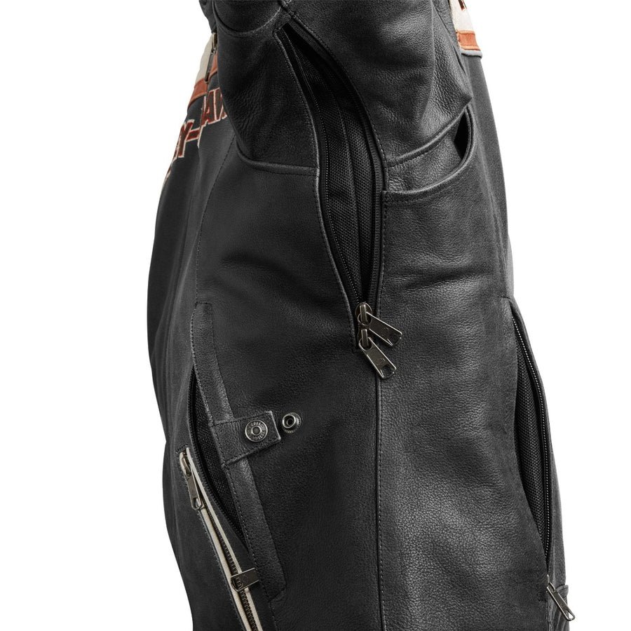 Firstly, the Women’s Triple Vent Jacket uses heavyweight cowhide leather for durability. Its distressed finish adds a worn-in charm that softens over time. The white base, black panels, and orange accents create a bold look. Consequently, princess seams enhance the feminine fit. Appliqué graphics nod to Harley’s 1930s racing roots. For insights on leather safety, see Dainese’s protection guide. Additionally, the jacket pairs well with Renegade Classics’ leather gear. In fact, its connection zipper links to Harley-Davidson’s riding pants for a secure fit.